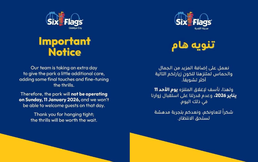 يمثل الإغلاق المؤقت لـ Six Flags القدية يوم الأحد 11 يناير 2026 محطة مهمة في مسيرة تطوير المنتزه. وبعيدًا عن كونه تراجعًا، يؤكد الإعلان التزام المنتزه بالجودة والابتكار ورضا الزوار.